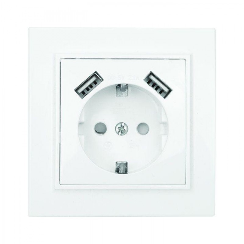 Розетка 1-м СП Минск 16А IP20 с заземл. защ. шторки с 2-мя заряд. устройствами USB 2.1А бел. EKF ERR16-028-100-2USB