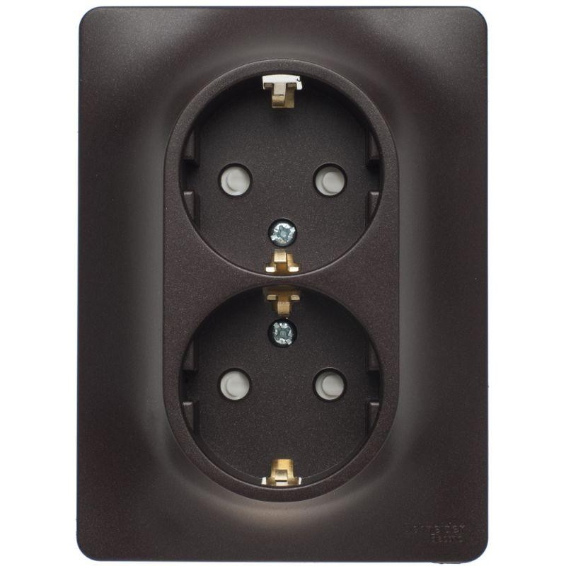 Розетка двойная Schneider Electric Glossa (в сборе, цвет шоколад) с заземлением и шторками подходит для сетей 250 В, на ток 16 А.