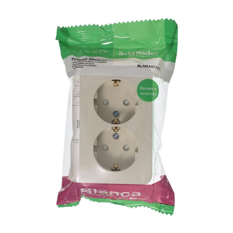 Розетка Schneider Electric BLANCA (открытой установки, цвет бежевый) двухместная с заземлением и шторками, с изолирующей пластиной подходит для сетей 250 В, на ток 16 А.