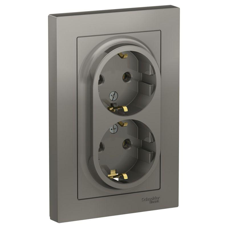 Розетка двойная Schneider Electric AtlasDesign (в сборе, цвет сталь) с заземлением, без шторок подходит для сетей 250 В, на ток 16 А.