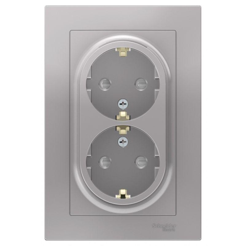 Розетка двойная Schneider Electric AtlasDesign (в сборе, цвет алюминий) с заземлением и шторками подходит для сетей 250 В, на ток 16 А.